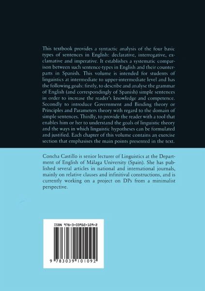 This textbook provides a syntactic analysis of the four basic types of sentences in English: declarative, interrogative, exclamative and imperative. It establishes a systematic comparison between such sentence-types in English and their counterparts in Spanish. This volume is intended for students of linguistics at intermediate to upper-intermediate level and has the following goals: firstly, to describe and analyse the grammar of English (and correspondingly of Spanish) simple sentences in order to increase the reader's knowledge and competence. Secondly to introduce Government and Binding theory or Principles and Parameters theory with regard to the domain of simple sentences. Thirdly, to provide the reader with a tool that enables him or her to understand the goals of linguistic theory and the ways in which linguistic hypotheses can be formulated and justified. Each chapter of this volume contains an exercise section that emphasises the main points presented in the text.