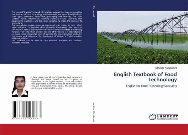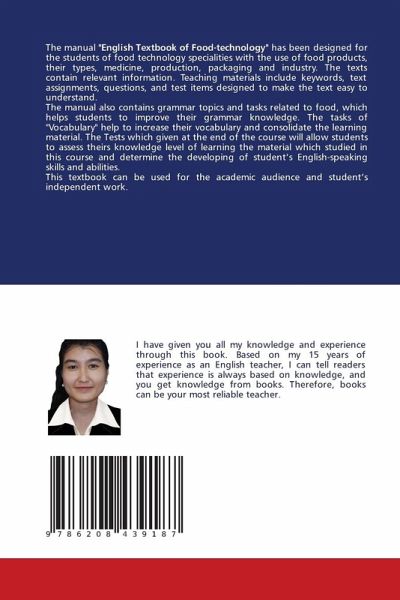 The manual "English Textbook of Food-technology" has been designed for the students of food technology specialities with the use of food products, their types, medicine, production, packaging and industry. The texts contain relevant information. Teaching materials include keywords, text assignments, questions, and test items designed to make the text easy to understand. The manual also contains grammar topics and tasks related to food, which helps students to improve their grammar knowledge. The tasks of "Vocabulary" help to increase their vocabulary and consolidate the learning material. The Tests which given at the end of the course will allow students to assess theirs knowledge level of learning the material which studied in this course and determine the developing of student's English-speaking skills and abilities. This textbook can be used for the academic audience and student's independent work.