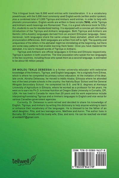 This trilingual book has 8,000 word entries with transliteration. It is a vocabulary powerhouse, with the 5,000 most commonly used English words (written and/or spoken), plus a combined total of 3,000 Tigrinya and Amharic word entries. In order to help with phonetic pronunciation, English words are written in Geez scripts (), while Tigrinya and Amharic word meanings are Romanized. Thus, it is a great reference book for ESL/ELL students to use for standardized testing. It is equipped with a concise yet informative introduction of the Tigrinya and Amharic languages. Both Tigrinya and Amharic are Semitic (Afro-Asiatic) languages derived from an ancient Ethiopian language, Geez; moreover, both languages share the same unique Geez alphabet, albeit with some pronunciation differences. Both languages are written from left to right. The quantity and uniqueness of the letters in the alphabet might be intimidating at the beginning, but there are some easy patterns that enable learning them faster. Once you have mastered the alphabet, it is rare to misspell words of Tigrinya or Amharic Tigrinya and Amharic are official languages in Eritrea and Ethiopia respectively; Tigrinya is spoken in both countries. The total population who speak the two languages in the two countries, including those who speak them as a second language, is estimated to be about 55 million people.