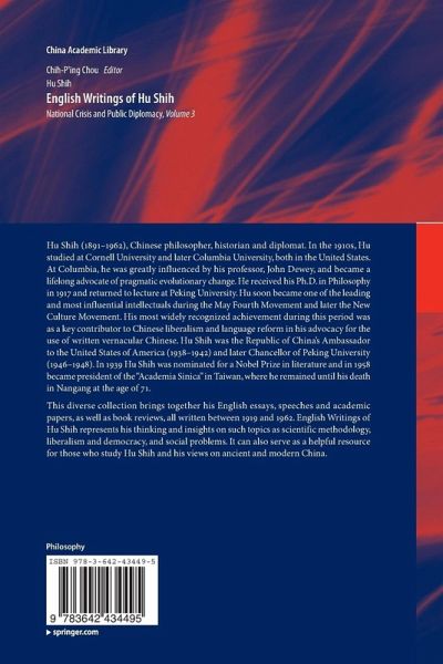 Hu Shih (1891-1962), Chinese philosopher, historian and diplomat. In the 1910s, Hu studied at Cornell University and later Columbia University, both in the United States. At Columbia, he was greatly influenced by his professor, John Dewey, and became a lifelong advocate of pragmatic evolutionary change. He received his Ph.D. in Philosophy in 1917 and returned to lecture at Peking University. Hu soon became one of the leading and most influential intellectuals during the May Fourth Movement and later the New Culture Movement. His most widely recognized achievement during this period was as a key contributor to Chinese liberalism and language reform in his advocacy for the use of written vernacular Chinese. Hu Shih was the Republic of China¡¯s Ambassador to the United States of America (1938¨C1942) and later Chancellor of Peking University (1946¨C1948). In 1939 Hu Shih was nominated for a Nobel Prize in literature and in 1958 became president of the ¡°Academia Sinica¡± in Taiwan, where he remained until his death in Nangang at the age of 71.This diverse collection brings together his English essays, speeches and academic papers, as well as book reviews, all written between 1919 and 1962. English Writings of Hu Shih represents his thinking and insights on such topics as scientific methodology, liberalism and democracy, and social problems. It can also serve as a helpful resource for those who study Hu Shih and his views on ancient and modern China.