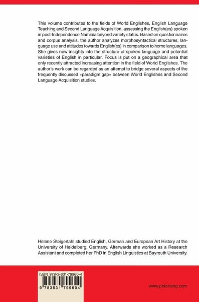This volume contributes to the fields of World Englishes, English Language Teaching and Second Language Acquisition, assessing the English(es) spoken in post-Independence Namibia beyond variety status. Based on questionnaires and corpus analysis, the author analyzes morphosyntactical structures, language use and attitudes towards English(es) in comparison to home languages. She gives new insights into the structure of spoken language and potential varieties of English in particular. Focus is put on a geographical area that only recently attracted increasing attention in the field of World Englishes. The author's work can be regarded as an attempt to bridge several aspects of the frequently discussed "paradigm gap" between World Englishes and Second Language Acquisition studies.