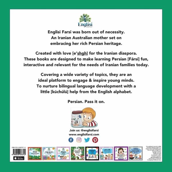 Englisi Farsi was born out of necessity. An Iranian Australian mother set on embracing her rich Persian heritage.Created with love [e'shgh] for the Iranian diaspora. These books are designed to make learning Persian [Fársí] fun, interactive and relevant for the needs of Iranian families today.Covering a wide variety of topics, they are an ideal platform to engage & inspire young minds. To nurture bilingual language development with a little [kúchúlú] help from the English alphabet.Persian. Pass it on.