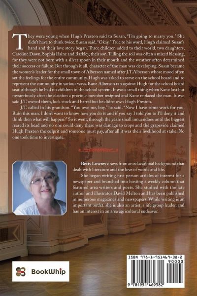 They were young when Hugh Preston said to Susan, "I’m going to marry you." She didn’t have to think twice. Susan said, "Okay." True to his word, Hugh claimed Susan’s hand and their love story began. Three children added to their world, two daughters, Caroline Dawn, Sophia Raine and Barkley, their son. Tilling the soil was often a mixed blessing, for they were not born with a silver spoon in their mouth and the weather often determined their success or failure. But through it all, character of the man was developing. Susan became the women’s leader for the small town of Alberson named after J.T.Alberson whose mood often set the feelings for the entire community. Hugh was asked to serve on the school board and to represent the community in various ways. Kane Alberson ran against Hugh for the school board seat, although he had no children in the school system. It was a small thing when Kane lost but mysteriously after the election a previous member resigned and Kane replaced the man. It was said J.T. owned them, lock stock and barrel but he didn’t own Hugh Preston. J.T. called in his grandson. "You owe me, boy," he said. "Now I have some work for you. Ruin this man. I don’t want to know how you do it and if you say I told you to I’ll deny it and think then what will happen?" So it went, through the years small innuendoes until the biggest reared its head and no one could deny there was damage to crops and the grapevine claimed Hugh Preston the culprit and someone must pay, after all it was their livelihood at stake. No one took time to investigate.