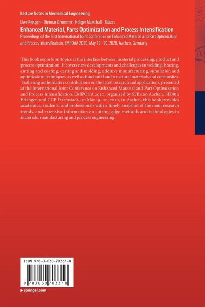 This book reports on topics at the interface between material processing, product and process optimization. It covers new developments and challenges in welding, brazing, cutting and coating, casting and molding, additive manufacturing, simulation and optimization techniques, as well as functional and structural materials and composites. Gathering authoritative contributions on the latest research and applications, presented at the International Joint Conference on Enhanced Material and Part Optimization and Process Intensification, EMPOrIA 2020, organized by SFB1120 Aachen, SFB814 Erlangen and CCE Darmstadt, on May 19-20, 2020, in Aachen, this book provides academics, students, and professionals with a timely snapshot of the main research trends, and extensive information on cutting-edge methods and technologies in materials, manufacturing and process engineering.