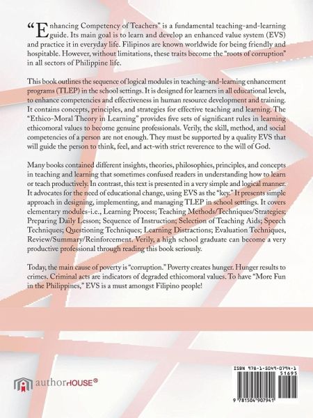 "Enhancing Competency of Teachers" is a fundamental teaching-and-learning guide. Its main goal is to learn and develop an enhanced value system (EVS) and practice it in everyday life. Filipinos are known worldwide for being friendly and hospitable. However, without limitations, these traits become the "roots of corruption" in all sectors of Philippine life. This book outlines the sequence of logical modules in teaching-and-learning enhancement programs (TLEP) in the school settings. It is designed for learners in all educational levels, to enhance competencies and effectiveness in human resource development and training. It contains concepts, principles, and strategies for effective teaching and learning. The "Ethico-Moral Theory in Learning" provides five sets of significant rules in learning ethicomoral values to become genuine professionals. Verily, the skill, method, and social competencies of a person are not enough. They must be supported by a quality EVS that will guide the person to think, feel, and act-with strict reverence to the will of God. Many books contained different insights, theories, philosophies, principles, and concepts in teaching and learning that sometimes confused readers in understanding how to learn or teach productively. In contrast, this text is presented in a very simple and logical manner. It advocates for the need of educational change, using EVS as the "key." It presents simple approach in designing, implementing, and managing TLEP in school settings. It covers elementary modules-i.e., Learning Process; Teaching Methods/Techniques/Strategies; Preparing Daily Lesson; Sequence of Instruction; Selection of Teaching Aids; Speech Techniques; Questioning Techniques; Learning Distractions; Evaluation Techniques, Review/Summary/Reinforcement. Verily, a high school graduate can become a very productive professional through reading this book seriously. Today, the main cause of poverty is "corruption." Poverty creates hunger. Hunger results to crimes. Criminal acts are indicators of degraded ethicomoral values. To have "More Fun in the Philippines," EVS is a must amongst Filipino people!