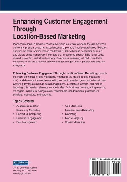 Proponents applaud location-based advertising as a way to bridge the gap between online and physical customer experiences and promote impulse purchases. Skeptics question whether location-based marketing (LBM) will cause consumer burn-out and violate consumer privacy if the data that is gathered through LBM is not used, shared, protected, and stored properly. Companies engaging in LBM should take measures to ensure customer privacy through stringent opt-in policies and security safeguards. Enhancing Customer Engagement Through Location-Based Marketing presents the main techniques of geo-marketing, introduces the idea of a "geo-marketing mix," and develops the mobile marketing concept based on geolocation techniques. Covering key topics such as data management, augmented location, and mobile targeting, this premier reference source is ideal for business owners, entrepreneurs, managers, marketers, policymakers, researchers, academicians, practitioners, scholars, instructors, and students.