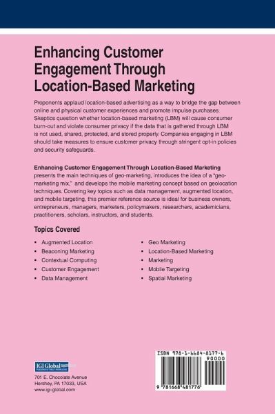 Proponents applaud location-based advertising as a way to bridge the gap between online and physical customer experiences and promote impulse purchases. Skeptics question whether location-based marketing (LBM) will cause consumer burn-out and violate consumer privacy if the data that is gathered through LBM is not used, shared, protected, and stored properly. Companies engaging in LBM should take measures to ensure customer privacy through stringent opt-in policies and security safeguards. Enhancing Customer Engagement Through Location-Based Marketing presents the main techniques of geo-marketing, introduces the idea of a "geo-marketing mix," and develops the mobile marketing concept based on geolocation techniques. Covering key topics such as data management, augmented location, and mobile targeting, this premier reference source is ideal for business owners, entrepreneurs, managers, marketers, policymakers, researchers, academicians, practitioners, scholars, instructors, and students.