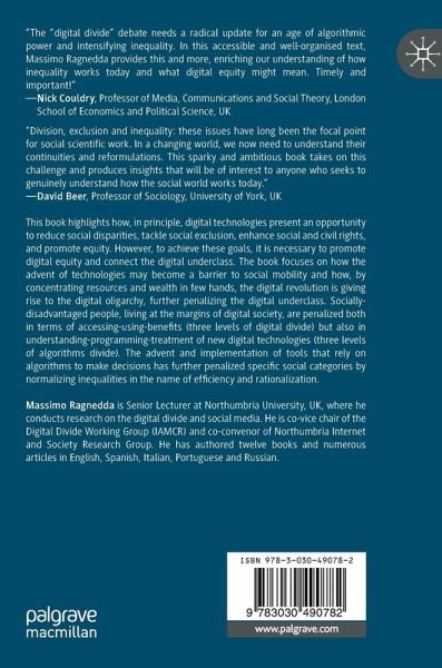 This book highlights how, in principle, digital technologies present an opportunity to reduce social disparities, tackle social exclusion, enhance social and civil rights, and promote equity. However, to achieve these goals, it is necessary to promote digital equity and connect the digital underclass. The book focuses on how the advent of technologies may become a barrier to social mobility and how, by concentrating resources and wealth in few hands, the digital revolution is giving rise to the digital oligarchy, further penalizing the digital underclass. Socially-disadvantaged people, living at the margins of digital society, are penalized both in terms of accessing-using-benefits (three levels of digital divide) but also in understanding-programming-treatment of new digital technologies (three levels of algorithms divide). The advent and implementation of tools that rely on algorithms to make decisions has further penalized specific social categories by normalizing inequalities inthe name of efficiency and rationalization.