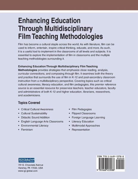 Film has become a cultural staple across the world. As with literature, film can be used to inform, entertain, inspire critical thinking, educate, and more. As such, it is a useful tool to implement in the classrooms of all levels and subjects. It is essential to explore the implementation of film in classrooms and the multiple teaching methodologies surrounding it. Enhancing Education Through Multidisciplinary Film Teaching Methodologies provides strategies that emphasize close reading, analysis, curricular connections, and composing through film. It examines both the theory and practice that surrounds the use of film in K-12 and post-secondary classroom instruction from a multidisciplinary perspective. Covering topics such as critical cultural awareness, literacy education, and film pedagogies, this premier reference source is an essential resource for preservice teachers, teacher educators, faculty and administrators of both K-12 and higher education, librarians, researchers, and academicians.