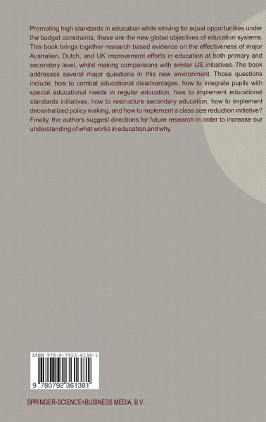 This book brings together research-based evidence on the effectiveness of major Australian, Dutch, and UK improvement efforts in education at both primary and secondary level, whilst making comparisons with similar US initiatives. The book addresses several major questions in this new environment. Those questions include: how to combat educational disadvantages, how to integrate pupils with special educational needs in regular education, how to implement educational standards initiatives, how to restructure secondary education, how to implement decentralized policy-making, and how to implement a class size reduction initiative? Finally, the authors suggest directions for future research in order to increase our understanding of what works in education and why.
