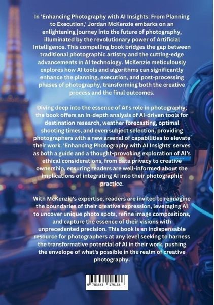 In 'Enhancing Photography with AI Insights: From Planning to Execution,' Jordan McKenzie embarks on an enlightening journey into the future of photography, illuminated by the revolutionary power of Artificial Intelligence. This compelling book bridges the gap between traditional photographic artistry and the cutting-edge advancements in AI technology. McKenzie meticulously explores how AI tools and algorithms can significantly enhance the planning, execution, and post-processing phases of photography, transforming both the creative process and the final outcomes.Diving deep into the essence of AI's role in photography, the book offers an in-depth analysis of AI-driven tools for destination research, weather forecasting, optimal shooting times, and even subject selection, providing photographers with a new arsenal of capabilities to elevate their work. 'Enhancing Photography with AI Insights' serves as both a guide and a thought-provoking exploration of AI's ethical considerations, from data privacy to creative ownership, ensuring readers are well-informed about the implications of integrating AI into their photographic practice.With McKenzie's expertise, readers are invited to reimagine the boundaries of their creative expression, leveraging AI to uncover unique photo spots, refine image compositions, and capture the essence of their visions with unprecedented precision. This book is an indispensable resource for photographers at any level seeking to harness the transformative potential of AI in their work, pushing the envelope of what's possible in the realm of creative photography.