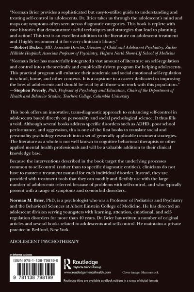 This book offers an innovative, trans-diagnostic approach to enhancing self-control in adolescents based directly on personality and social psychological science. It thus fills a void. While several books address specific disorders such as ADHD, poor school performance, and aggression, this is one of the first books to translate social and personality psychology research into a set of generally applicable treatment strategies. This literature as a whole is not well known to cognitive behavioral therapists or other applied mental health professionals and will be a valuable addition to their clinical knowledge base. Because the interventions described in the book target the underlying processes common to self-control (rather than to specific diagnostic entities), clinicians do not have to master a treatment manual for each individual disorder. Instead, they are provided with treatment tools that they can modify and use flexibly with the large number of adolescent referred because of problems with self-control, who typically present with a range of symptoms and co-morbid disorders.