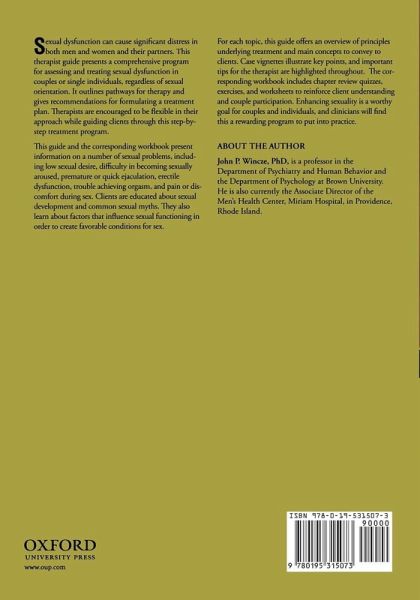 Sexual dysfunction can cause significant distress in both men and women and their partners. This therapist guide presents a comprehensive program for assessing and treating sexual dysfunction in couples or single individuals, regardless of sexual orientation. It outlines pathways for therapy and gives recommendations for formulating a treatment plan. Therapists are encouraged to be flexible in their approach while guiding clients through this step-by-step program. The guide and corresponding workbook present information on a number of sexual problems including low sexual desire, difficulty becoming sexually aroused, premature or quick ejaculation, erectile dysfunction, trouble achieving orgasm, and pain or discomfort during sex. Clients are educated about sexual development and common sexual myths. They also learn about factors that influence sexual functioning in order to create favorable conditions for sex. For each topic, this guide offers an overview of principles underlying treatment and main concepts to convey to clients. Case vignettes illustrate key points and important tips for the therapist are highlighted throughout. The corresponding workbook includes chapter review quizzes, exercises, and worksheets to reinforce client understanding and couple participation. Enhancing sexuality is a worthy goal for couples and individuals, and clinicians will find this a rewarding program to put into practice.