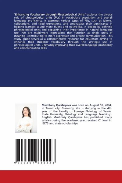 "Enhancing Vocabulary through Phraseological Units" explores the pivotal role of phraseological units (PUs) in vocabulary acquisition and overall language proficiency. It examines various types of PUs, such as idioms, collocations, and fixed expressions, and emphasizes their significance in helping learners sound more fluent and native-like. It begins by defining phraseological units and explaining their importance in natural language use. PUs are multi-word expressions that function as single units of meaning, contributing to more expressive and precise communication. This study guide serves as a comprehensive resource for educators aiming to enhance their students' vocabulary through the strategic use of phraseological units, ultimately improving their overall language proficiency and communication skills.