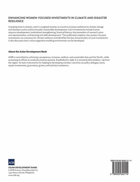 This publication explores why targeted investments in women are crucial to increase resilience to climate change and disasters and to achieve broader sustainable development. Such investments include human resource development, institutional strengthening, financial literacy, the promotion of women's voice and representation, and learning and skills development. The publication explains why women-focused investments are necessary for climate resilience and identifies the key characteristics of such investments. It also discusses how a more supportive enabling environment can be developed.