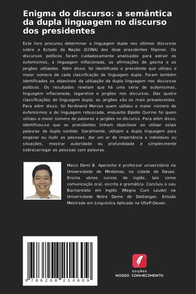 Este livro procurou determinar a linguagem dupla nos últimos discursos sobre o Estado da Nação (SONA) dos doze presidentes filipinos. Os discursos políticos foram cuidadosamente analisados para extrair os eufemismos, a linguagem inflacionada, as afirmações de gosma e os jargões utilizados. Além disso, foi identificado o presidente que utilizou o maior número de cada classificação de linguagem dupla. Foram também identificados os objectivos da utilização da dupla linguagem nos discursos políticos. Os resultados revelam que há uma série de eufemismos, linguagem inflacionada, tagarelice e jargões nos discursos. Das quatro classificações de linguagem dupla, os jargões são os mais prevalecentes. Para além disso, foi Ferdinand Marcos quem utilizou o maior número de eufemismos e de linguagem rebuscada, enquanto Elpidio Quirino foi quem utilizou o maior número de palavras e jargões no discurso. Para além disso, identificou-se que os presidentes tinham objectivos ao utilizar estas palavras de duplo sentido. Geralmente, utilizam a dupla linguagem para enganar ou iludir as pessoas, dar um ar de importância a indivíduos ou situações, mostrar autoridade ou profundidade e simplesmente sobrecarregar as pessoas com palavras.