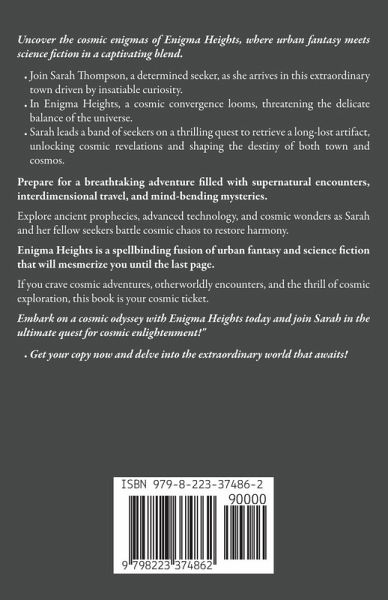 Uncover the cosmic enigmas of Enigma Heights, where urban fantasy meets science fiction in a captivating blend.Join Sarah Thompson, a determined seeker, as she arrives in this extraordinary town driven by insatiable curiosity. In Enigma Heights, a cosmic convergence looms, threatening the delicate balance of the universe. Sarah leads a band of seekers on a thrilling quest to retrieve a long-lost artifact, unlocking cosmic revelations and shaping the destiny of both town and cosmos. Prepare for a breathtaking adventure filled with supernatural encounters, interdimensional travel, and mind-bending mysteries. Explore ancient prophecies, advanced technology, and cosmic wonders as Sarah and her fellow seekers battle cosmic chaos to restore harmony. Enigma Heights is a spellbinding fusion of urban fantasy and science fiction that will mesmerize you until the last page. If you crave cosmic adventures, otherworldly encounters, and the thrill of cosmic exploration, this book is your cosmic ticket. Embark on a cosmic odyssey with Enigma Heights today and join Sarah in the ultimate quest for cosmic enlightenment!"Get your copy now and delve into the extraordinary world that awaits!