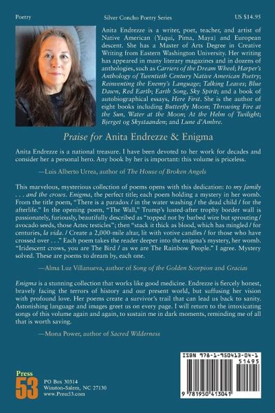 Enigma is a stunning collection that works like good medicine. Endrezze is fiercely honest, bravely facing the terrors of history and our present world, but suffusing her vision with profound love. Her poems create a survivor's trail that can lead us back to sanity. Astonishing language and images greet us on every page. I will return to the intoxicating songs of this volume again and again, to sustain me in dark moments, reminding me of all that is worth saving. -Mona Power