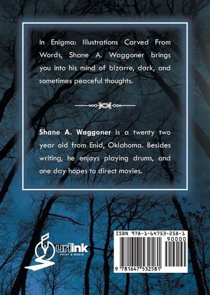 In Enigma: Illustrations Carved FromWords, Shane A. Waggoner bringsyou into his mind of bizarre, dark, andsometimes peaceful thoughts. ________________________ Shane A. Waggoner is a twenty twoyear old from Enid, Oklahoma. Besideswriting, he enjoys playing drums, andone day hopes to direct movies.
