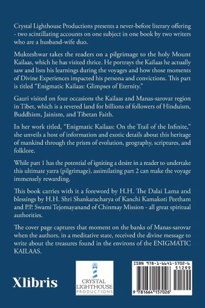 Crystal Lighthouse Productions presents a never-before literary offering - two scintillating accounts on one subject in one book by two writers who are a husband-wife duo. Mukteshwar takes the readers on a pilgrimage to the holy Mount Kailaas, which he has visited thrice. He portrays the Kailaas he actually saw and lists his learnings during the voyages and how those moments of Divine Experiences impacted his persona and convictions. This part is titled "Enigmatic Kailaas: Glimpses of Eternity." Gauri visited on four occasions the Kailaas-Mansarovar region in Tibet, which is a revered land for billions of followers of Hinduism, Buddhism, Jainism, and Tibetan Faith. In her work titled, "Enigmatic Kailaas: On the Trail of the Infinite," she unveils a host of information and exotic details about this heritage of mankind through the prism of evolution, geography, scriptures, and folklore. While part 1 has the potential of igniting a desire in a reader to undertake this ultimate yatra (pilgrimage), assimilating part 2 can make the voyage immensely rewarding. This book carries with it a foreword by H.H. The Dalai Lama and blessings by H.H. Shri Shankaracharya of Kanchi Kamakoti Peetham and P.P. Swami Tejomayanand of Chinmay Mission - all great spiritual authorities. The cover page captures that moment on the banks of Mansarovar when the authors, in a meditative state, received the divine message to write about the treasures found in the environs of the ENIGMATIC KAILAAS.