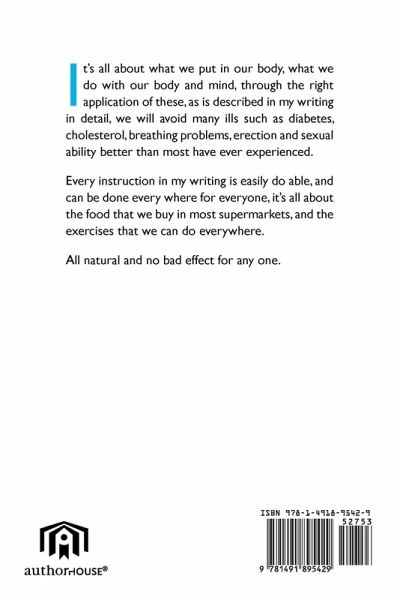 It's all about what we put in our body, what we do with our body and mind, through the right application of these, as is described in my writing in detail, we will avoid many ills such as diabetes, cholesterol, breathing problems, erection and sexual ability better than most have ever experienced, a perfect sleep that mind is stopped working so you are up fresh and full of energy, the daily management of our life becomes our automated new way of life that we will enjoy for all our days for the rest of our life. Every instruction in my writing is easily do able, and can be done every where for…mehr