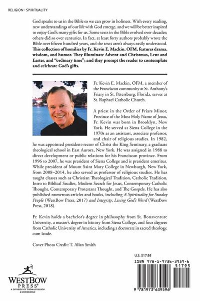 God speaks to us in the Bible so we can grow in holiness. With every reading, new understandings of our life with God emerge, and we will be better inspired to enjoy God's many gifts for us. Some texts in the Bible evolved over decades; others did so over centuries. In fact, at least forty authors probably wrote the Bible over fifteen hundred years, and the texts aren't always easily understood. This collection of homilies by Fr. Kevin E. Mackin, OFM, features drama, wisdom, and humor. They illuminate Advent and Christmas, Lent and Easter, and "ordinary time"; and they prompt the reader to contemplate and celebrate God's gifts.