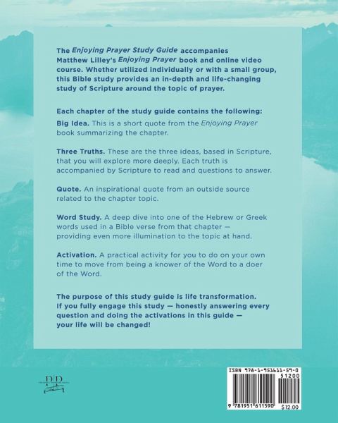 The Enjoying Prayer Study Guide accompanies Matthew Lilley's Enjoying Prayer book and online video course. Whether utilized individually or with a small group, this Bible study provides an in-depth and life-changing study of Scripture around the topic of prayer. Each chapter of the study guide contains the following:Big Idea. This is a short quote from the Enjoying Prayer book summarizing the chapter. Three Truths. These are the three ideas, based in Scripture, that you will explore more deeply. Each truth is accompanied by Scripture to read and questions to answer. Quote. An inspirational quote from an outside source related to the chapter topic. Word Study. A deep dive into one of the Hebrew or Greek words used in a Bible verse from that chapter - providing even more illumination to the topic at hand. Activation. A practical activity for you to do on your own time to move from being a knower of the Word to a doer of the Word. The purpose of this study guide is life transformation. If you fully engage this study - honestly answering every question and doing the activations in this guide - your life will be changed!