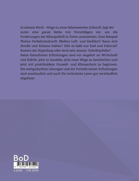 In seinem Werk - Wege zu einer lebenswerten Zukunft, legt der Autor eine ganze Reihe von Vorschlägen vor, um die Forderungen der Klimapolitik in Taten umzusetzen. Zum Beispiel Thema Verkehrszukunft: Bleiben Luft- und Seefahrt? Kann sich Straße und Schiene halten? Gibt es bald nur Esel und Fahrrad? Kommt der Hyperloop oder doch sein Ansatz: TubeWaySolar? Seine lizenzfreien Erfindungen sind ein Angebot an Wirtschaft und Politik, jetzt zu handeln, jetzt neue Wege zu beschreiten und jetzt mit praktikablem Umwelt- und Klimaschutz zu beginnen. Die weitgedachten Lösungen und die Vorteile seiner Erfindungen sind anschaulich und auch für technische Laien gut verständlich abgefasst.
