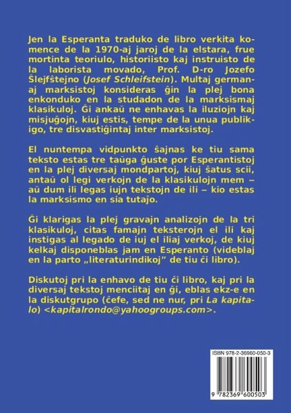 Jen la Esperanta versio de libro verkita komence de la 1970-aj jaroj de la elstara, frue mortinta teoriulo, historiisto kaj instruisto de la laborista movado, Prof. D-ro Jozefo ¿lejf¿tejno (germane: Josef Schleifstein). Multaj germanaj marksistoj konsideras ¿in la plej bona enkonduko en la studadon de la marksismaj klasikuloj. ¿i ankau ne enhavas la iluziojn kaj misjüojn, kiuj estis, tempe de la unua publikigo, tre disvasti¿intaj inter marksistoj. El nuntempa vidpunkto ¿ajnas, ke tiu sama teksto estas tre tauga ¿uste por Esperantistoj en la plej diversaj mondpartoj, kiuj ¿atus scii, antau ol legi verkojn de la klasikuloj mem - au dum ili legas iujn tekstojn de ili - kio estas la marksismo en sia tutäo. ¿i klarigas la plej gravajn analizojn de la tri klasikuloj, citas famajn teksterojn el ili kaj instigas al legado de iuj el iliaj verkoj, de kiuj kelkaj disponeblas jam en Esperanto (videblaj en la parto „literaturindikoj" de tiu ¿i libro).