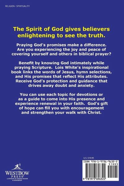 The Spirit of God gives believers enlightening to see the truth. Praying God's promises make a difference. Are you experiencing the joy and peace of covering yourself and others in biblical prayer? Benefit by knowing God intimately while praying Scripture. Lois White's inspirational book links the words of Jesus, hymn selections, and His promises that reflect His attributes. Receive God's protection and guidance that drives away doubt and anxiety. You can use each topic for devotions or as a guide to come into His presence and experience renewal in your faith. God's gift of hope can fill you with encouragement and strengthen your walk with Christ.