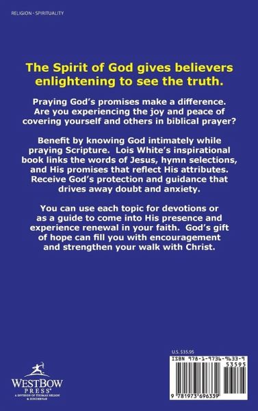 The Spirit of God gives believers enlightening to see the truth. Praying God's promises make a difference. Are you experiencing the joy and peace of covering yourself and others in biblical prayer? Benefit by knowing God intimately while praying Scripture. Lois White's inspirational book links the words of Jesus, hymn selections, and His promises that reflect His attributes. Receive God's protection and guidance that drives away doubt and anxiety. You can use each topic for devotions or as a guide to come into His presence and experience renewal in your faith. God's gift of hope can fill you with encouragement and strengthen your walk with Christ.