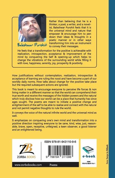 Poetry Book on environment How justifications without contemplation, realization, introspection & acceptance of learning are ruling the roost and have become a part of our worldly daily norms. How talks about change for the positive take place but the required subsequent actions are ignored. This poetry book on environment is meant to encourage everyone to perceive life forces & non living matter in a different manner so that the world can comprehend their true worth and receive the messages of the hidden powers and the natural which truly disclose how our world can be a place that humanity has since ages sought. The poems are meant to initiate a positive change and enlightenment of the self to be able to realise and connect with the natural and not permit negative thoughts to rule the world. It conveys the voice of the natural infinite world and the universal mind as well. It emphasizes on conquering one's own mind and transformation into a positive direction inspiring everyone to be sane, kind, wise, just, reasonable, brave, open, receptive, unfeigned, a keen observer, a good listener and an enlightened being.