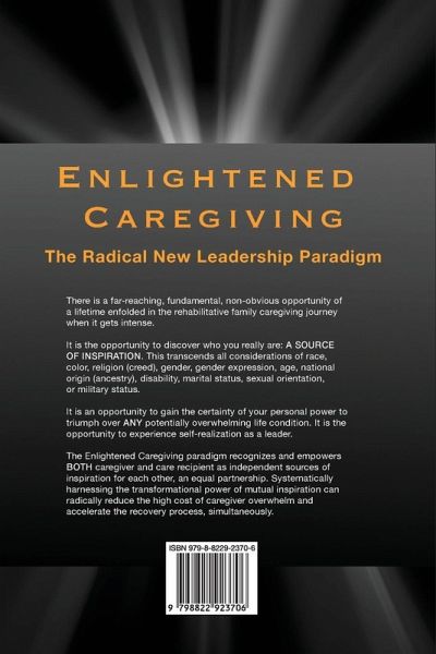 Enlightened Caregiving is a radical new caregiving paradigm for rehabilitative family caregiving. It recognizes and empowers both caregiver and care recipient as Independent Sources of Inspiration for each other, an equal partnership. Systematically harnessing the transformational power of mutual inspiration can radically reduce the high cost of caregiver overwhelm and accelerate the recovery process, simultaneously. There is a far-reaching, fundamental, non-obvious opportunity of a lifetime enfolded in the rehabilitative family caregiving journey when it gets intense. It is the opportunity to discover who you really are: A SOURCE OF INSPIRATION. It is an opportunity to gain the certainty of your personal power to triumph over ANY potentially overwhelming life condition. It is the opportunity for self-realization.