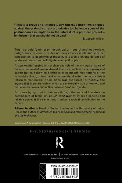 This is a bold and controversial feminist, philosophical critique of postmodernism. Whilst providing a brief and accessible introduction to postmodernist feminist thought, Enlightened Women is also a unique defence of realism and enlightenment philosophy. The first half of the book covers an analysis of some of the most influential postmodernist theorists, such as Luce Irigaray and Judith Butler. In the second half Alison Assiter advocates a return to modernism in feminism. She argues, against the current orthodoxy, that there can be a distinction between "sex" and "gender". For students trying to pick their way through the maze of literature in the area of postmodernist feminism, Enlightened Women is a concise guide to contemporary thought - as well as a radical contribution to the debate.