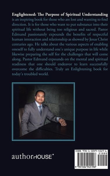 Englightened: The Purpose of Spiritual Understanding is an inspiring book for those who are lost and wanting to find direction. It is for those who want to put substance into their spiritual life without being too religious and sacred. Pastor Edmund passionately expounds the benefits of respectful human interaction and relationship as showed by Jesus Christ centuries ago. He talks about the various aspects of enabling oneself to fully understand one's unique purpose in life while likewise preparing the self for the challenges that will come along. Pastor Edmund expounds on the mental and spiritual readiness that one should endeavor to learn successfully overcome the difficulties. Truly an Enlightening book for today's troubled world.