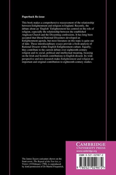 This book makes a comprehensive reassessment of the relationship between Enlightenment and religion in England. The debate about an 'English' Enlightenment has centred on the role of religion, especially the relationship between the established Anglican Church and the dissenting confessions. It has long been accepted that liberal, rational dissenters developed an Enlightenment agenda, but most literature on this topic is quite out of date. These interdisciplinary essays provide a fresh analysis of rational dissent within English Enlightenment culture. Equally, they contribute to the debate over eighteenth-century religion and its social, political and intellectual meaning, focusing on the Irish and Scottish contributions to English dissent. Its wide perspective and research make Enlightenment and Religion an important and original contribution to eighteenth-century studies.