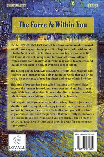 ENLIGHTENMENT EVERYONE is a book and fellowship created for all those engaged in the pursuit of happiness, who wish to take it to the Next Level. It is for those who have tasted success in life, yet found it was not enough, and for those who have suffered - from a subtle daily anxiety about what may come, to a past wound that does not seem to heal, or even to a deeper terror. The 13 Steps of the ENLIGHTENMENT EVERYONE program will lead you on a journey to the only place in the world that can bring you to an experience of true happiness and peace of mind; within. This kind of process has been called 'Walking the Razor's Edge,' because the journey inward, into your own mind and heart, may begin with fear and anxiety. It means deciding to follow the white rabbit down the rabbit hole to see what lurks beneath. But despair not, if you choose to take the leap. For this journey is also the most fun, joyful, and happy journey that anyone can take. You will be on a journey to learn the truth about yourself - a truth so glorious, so lovely and magnificent, that there really are no words to describe It. You are Divine, and you are eternal. The 13 Steps of ENLIGHTENMENT EVERYONE provide a way for you to prove it to yourself.