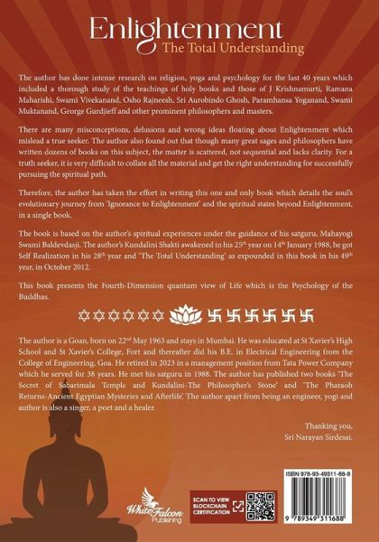 The author has done intense research on religion, yoga and psychology for the last 40 years which included a thorough study of the teachings of holy books and those of J Krishnamurti, Ramana Maharishi, Swami Vivekanand, Osho Rajneesh, Sri Aurobindo Ghosh, Paramhansa Yoganand, Swami Muktanand, George Gurdjieff and other prominent philosophers and masters. There are many misconceptions, delusions and wrong ideas floating about Enlightenment which mislead a true seeker. The author also found out that though many great sages and philosophers have written dozens of books on this subject, the matter is scattered, not sequential and lacks clarity. For truth seekers, thinkers or professionals, it is very difficult to collate all the material and get the right understanding for successfully pursuing the spiritual path. Therefore, the author has taken the effort in writing this book which details the soul's evolutionary journey from 'Ignorance to Enlightenment' and the spiritual states beyond Enlightenment, in a single book. This is a 'Book of Secrets'. This book explains in detail what is meant by Enlightenment attained by Buddha under the Bodhi tree, the mutation in the brain involved and the steps to attain it. This is the only book available in the world of this kind. This book is a summary of the 3500 years of teachings of ancient rishis. The last chapter on 'Secret ashrams in the Himalayas and Tall Mahadev's' is one of the greatest mysteries on earth and only a handful know of it. The book is based on the author's spiritual experiences under the guidance of his satguru, Mahayogi Swami Baldevdasji. The author's Kundalini Shakti awakened in his 25th year on 14th January 1988, he got Self Realization in his 28th year and 'The Total Understanding' as expounded in this book in his 49th year, in October 2012. An intellectual has only a three-dimensional view of life. This book presents the Fourth-Dimension quantum view of Life which is the Psychology of the Buddhas.