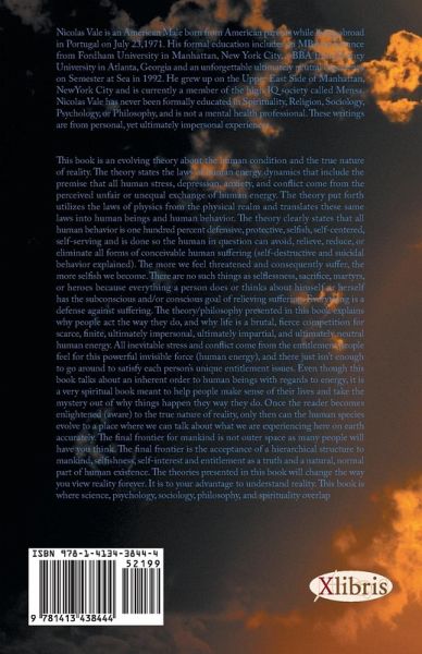 This book is an evolving theory about the human condition and the true nature of reality. The theory states the laws of human energy dynamics that include the premise that all human stress, depression, anxiety, and conflict come from the perceived unfair or unequal exchange of human energy. The theory put forth utilizes the laws of physics from the physical realm and translates these same laws into human beings and human behavior. The theory clearly states that all human behavior is one hundred percent defensive, protective, selfish, self-centered, self-serving and is done so the human in question can avoid, relieve, reduce, or eliminate all forms of conceivable human suffering (self-destructive and suicidal behavior explained). The more we feel threatened and consequently suffer, the more selfish we become. There are no such things as selflessness, sacrifice, martyrs, or heroes because everything a person does or thinks about himself or herself has the subconscious and/or conscious goal of relieving suffering. Everything is a defense against suffering. The theory/philosophy presented in this book explains why people act the way they do, and why life is a brutal, fierce competition for scarce, finite, ultimately impersonal, ultimately impartial, and ultimately neutral human energy. All inevitable stress and conflict come from the entitlement people feel for this powerful invisible force (human energy), and there just isn't enough to go around to satisfy each person's unique entitlement issues. Even though this book talks about an inherent order to human beings with regards to energy, it is a very spiritual book meant to help people make sense of their lives and take the mystery out of why things happen they way they do. Once the reader becomes enlightened (aware) to the true nature of reality, only then can the human species evolve to a place where we can talk about what we are experiencing here on earth accurately. The final frontier for mankind is not o
