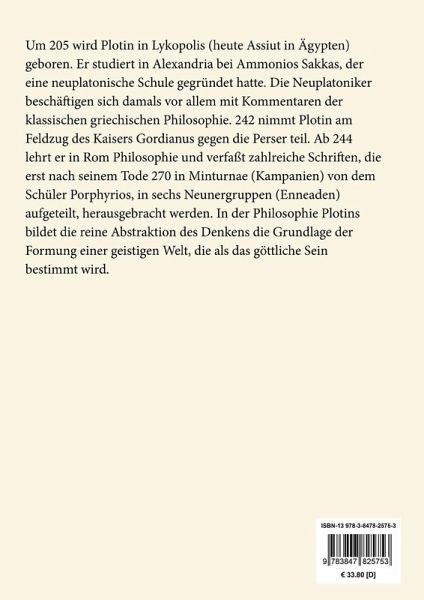 Plotin: Enneaden Lesefreundlicher Großdruck in 16-pt-Schrift Großformat, 210 x 297 mm Berliner Ausgabe, 2019 Durchgesehener Neusatz bearbeitet und eingerichtet von Theodor Borken Entstanden von 254 bis 270. Die Einteilung von Plotins Schriften in sechs Neunergruppen (Enneaden) stammt von Porphyrios, einem seiner Schüler, der sie nach dem Tod des Lehrers herausgab. Erstdruck in lateinischer Übersetzung durch Marsilio Ficino: Florenz 1492. Der Text folgt der ersten vollständigen deutschen Übersetzung durch Hermann Friedrich Müller von 1878. Textgrundlage sind die Ausgaben: Plotin: Die Enneaden. Übersetzt von Hermann Friedrich Müller. Band 1 und 2, Berlin: Weidmann, 1878/80. Dieses Buch folgt in Rechtschreibung und Zeichensetzung obiger Textgrundlage. Umschlaggestaltung von Thomas Schultz-Overhage unter Verwendung des Bildes: Platons Akademie, Mosaikfußboden in Pompeji, 1. Jahrhundert n. Chr.. Gesetzt aus der Minion Pro, 16 pt. Henricus Edition Deutsche Klassik UG (haftungsbeschränkt) Über den Autor: Um 205 wird Plotin in Lykopolis (heute Assiut in Ägypten) geboren. Er studiert in Alexandria bei Ammonios Sakkas, der eine neuplatonische Schule gegründet hatte. Die Neuplatoniker beschäftigen sich damals vor allem mit Kommentaren der klassischen griechischen Philosophie. 242 nimmt Plotin am Feldzug des Kaisers Gordianus gegen die Perser teil. Ab 244 lehrt er in Rom Philosophie und verfaßt zahlreiche Schriften, die erst nach seinem Tode 270 in Minturnae (Kampanien) von dem Schüler Porphyrios, in sechs Neunergruppen (Enneaden) aufgeteilt, herausgebracht werden. In der Philosophie Plotins bildet die reine Abstraktion des Denkens die Grundlage der Formung einer geistigen Welt, die als das göttliche Sein bestimmt wird.