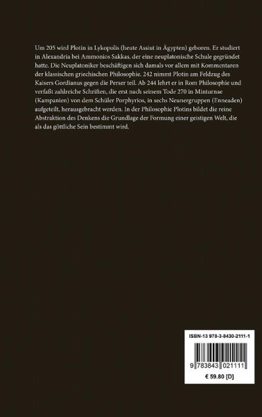Plotin: Enneaden Entstanden von 254 bis 270. Die Einteilung von Plotins Schriften in sechs Neunergruppen (Enneaden) stammt von Porphyrios, einem seiner Schüler, der sie nach dem Tod des Lehrers herausgab. Erstdruck in lateinischer Übersetzung durch Marsilio Ficino: Florenz 1492. Der Text folgt der ersten vollständigen deutschen Übersetzung durch Hermann Friedrich Müller von 1878. Vollständige Neuausgabe mit einer Biographie des Autors. Herausgegeben von Karl-Maria Guth. Berlin 2013. Textgrundlage sind die Ausgaben: Plotin: Die Enneaden. Übersetzt von Hermann Friedrich Müller. Band 1 und 2, Berlin: Weidmann, 1878/80. Die Paginierung obiger Ausgaben wird in dieser Neuausgabe als Marginalie zeilengenau mitgeführt. Umschlaggestaltung von Thomas Schultz-Overhage unter Verwendung des Bildes: Platons Akademie, Mosaikfußboden in Pompeji, 1. Jahrhundert n. Chr.. Gesetzt aus Minion Pro, 11 pt. Über den Autor: Um 205 wird Plotin in Lykopolis (heute Assiut in Ägypten) geboren. Er studiert in Alexandria bei Ammonios Sakkas, der eine neuplatonische Schule gegründet hatte. Die Neuplatoniker beschäftigen sich damals vor allem mit Kommentaren der klassischen griechischen Philosophie. 242 nimmt Plotin am Feldzug des Kaisers Gordianus gegen die Perser teil. Ab 244 lehrt er in Rom Philosophie und verfaßt zahlreiche Schriften, die erst nach seinem Tode 270 in Minturnae (Kampanien) von dem Schüler Porphyrios, in sechs Neunergruppen (Enneaden) aufgeteilt, herausgebracht werden. In der Philosophie Plotins bildet die reine Abstraktion des Denkens die Grundlage der Formung einer geistigen Welt, die als das göttliche Sein bestimmt wird.