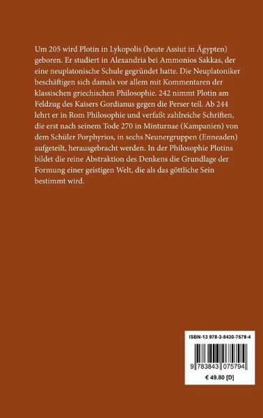 Plotin: Enneaden Entstanden von 254 bis 270. Die Einteilung von Plotins Schriften in sechs Neunergruppen (Enneaden) stammt von Porphyrios, einem seiner Schüler, der sie nach dem Tod des Lehrers herausgab. Erstdruck in lateinischer Übersetzung durch Marsilio Ficino: Florenz 1492. Der Text folgt der ersten vollständigen deutschen Übersetzung durch Hermann Friedrich Müller von 1878. Vollständige Neuausgabe mit einer Biographie des Autors. Herausgegeben von Karl-Maria Guth. Berlin 2015. Textgrundlage sind die Ausgaben: Plotin: Die Enneaden. Übersetzt von Hermann Friedrich Müller. Band 1 und 2, Berlin: Weidmann, 1878/80. Die Paginierung obiger Ausgaben wird in dieser Neuausgabe als Marginalie zeilengenau mitgeführt. Umschlaggestaltung von Thomas Schultz-Overhage unter Verwendung des Bildes: Platons Akademie, Mosaikfußboden in Pompeji, 1. Jahrhundert n. Chr.. Gesetzt aus Minion Pro, 11 pt. Über den Autor: Um 205 wird Plotin in Lykopolis (heute Assiut in Ägypten) geboren. Er studiert in Alexandria bei Ammonios Sakkas, der eine neuplatonische Schule gegründet hatte. Die Neuplatoniker beschäftigen sich damals vor allem mit Kommentaren der klassischen griechischen Philosophie. 242 nimmt Plotin am Feldzug des Kaisers Gordianus gegen die Perser teil. Ab 244 lehrt er in Rom Philosophie und verfaßt zahlreiche Schriften, die erst nach seinem Tode 270 in Minturnae (Kampanien) von dem Schüler Porphyrios, in sechs Neunergruppen (Enneaden) aufgeteilt, herausgebracht werden. In der Philosophie Plotins bildet die reine Abstraktion des Denkens die Grundlage der Formung einer geistigen Welt, die als das göttliche Sein bestimmt wird.