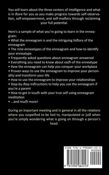 You will learn about the three centers of intelligence and what is in store for you as you make progress towards self-observation, self-empowerment, and self-mastery through reclaiming your full potential. Here's a sample of what you're going to learn in the enneagram: ¿ What the enneagram is and the intriguing history of the enneagram ¿ The nine enneatypes of the enneagram and how to identify your enneatype ¿ Frequently asked questions about enneagram answered ¿ Everything you need to know about each of the enneatype ¿ How the enneagram can help you conquer your workplace ¿ Proven ways to use the enneagram to improve your personality and transform your life ¿ How to use the enneagram to improve your relationships ¿ Step-by-step instructions to help you use the enneagram if you're a parent ¿ How to get in touch with your true self using enneagram meditation ¿ ...and much more! During an important meeting and in general in all the relations where you suspected to be lied to, manipulated or just when you're simply wondering what is going on through a person's head.