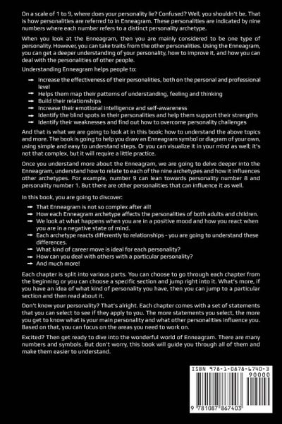 On a scale of 1 to 9, where does your personality lie? Confused? Well, you shouldn't be. That is how personalities are referred to in Enneagram. These personalities are indicated by nine numbers where each number refers to a distinct personality archetype. When you look at the Enneagram, then you are mainly considered to be one type of personality. However, you can take traits from the other personalities. Using the Enneagram, you can get a deeper understanding of your personality, how to improve it, and how you can deal with the personalities of other people. And that is what we are going to look at in this book; how to understand the above topics and more. The book is going to help you draw an Enneagram symbol or diagram of your own, using simple and easy to understand steps. Or you can visualize it in your mind as well; it's not that complex, but it will require a little practice. Once you understand more about the Enneagram, we are going to delve deeper into the Enneagram, understand how to relate to each of the nine archetypes and how it influences other archetypes. For example, number 9 can lean towards personality number 8 and personality number 1. But there are other personalities that can influence it as well. Each chapter is split into various parts. You can choose to go through each chapter from the beginning or you can choose a specific section and jump right into it. What's more, if you have an idea of what kind of personality you have, then you can jump to a particular section and then read about it. Don't know your personality? That's alright. Each chapter comes with a set of statements that you can select to see if they apply to you. The more statements you select, the more you get to know what is your main personality and what other personalities influence you. Based on that, you can focus on the areas you need to work on. Excited? Then get ready to dive into the wonderful world of Enneagram. There are many numbers and symbols. But don't worry, this book will guide you through all of them and make them easier to understand.