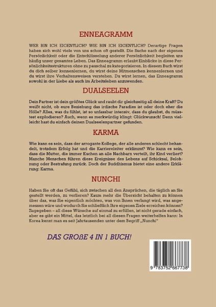 ENNEAGRAMMWER BIN ICH EIGENTLICH? WIE BIN ICH EIGENTLICH? Derartige Fragen haben sich wohl viele von uns schon oft gestellt. Die Suche nach der eigenen Persönlichkeit oder die Entschlüsselung anderer Persönlichkeit begleiten uns häufig unser gesamtes Leben. Das Enneagramm erlaubt Einblicke in diese Persönlichkeitsstrukturen ohne zu pauschal zu kategorisieren. In diesem Buch wirst du dich selber kennenlernen, du wirst deine Mitmenschen kennenlernen und du wirst ihre Verhaltensweisen verstehen. Du wirst lernen, das Enneagramm sowohl in der Liebe als auch im Arbeitsleben anzuwenden.DUALSEELENDein Partner ist dein größtes Glück und raubt dir gleichzeitig all deine Kraft? Du weißt nicht, ob eure Beziehung das irdische Paradies ist oder doch eher die Hölle? Alles, was du fühlst, ist so unfassbar intensiv, dass du glaubst, du müsstest explodieren? Auch, wenn es merkwürdig klingt: Glückwunsch! Denn vielleicht hast du einfach deinen Dualseelenpartner gefunden. KARMAWie kann es sein, dass der arrogante Kollege, der alle anderen schlecht behandelt, trotzdem Erfolg hat und die Karriereleiter erklimmt? Wie kann es sein, dass die Mutter, die immer Kuchen an alle Nachbarn verteilt, ihr Kind verliert? Manche Menschen führen diese Ereignisse des Lebens auf Schicksal, Belohnung oder Bestrafung zurück. Doch der Buddhismus bietet eine andere Erklärung: Karma.NUNCHIHaben Sie oft das Gefühl, sich zwischen all den Ansprüchen, die täglich an Sie gestellt werden, zu verlieren? Kaum mehr die Übersicht behalten zu können über das, was Sie eigentlich möchten, was von Ihnen verlangt wird, was angemessen wäre und wodurch Sie schließlich Ihre eigenen Ziele erreichen können? Zugegeben - all diese Wünsche auf einmal zu erfüllen, ist nicht gerade einfach, aber es gibt ein Mittel, das letztlich bei all diesen Fragen weiterhelfen kann: In Korea kennt man es seit Jahrtausenden unter dem Begriff ,,Nunchi''DAS GROßE 4 IN 1 BUCH!