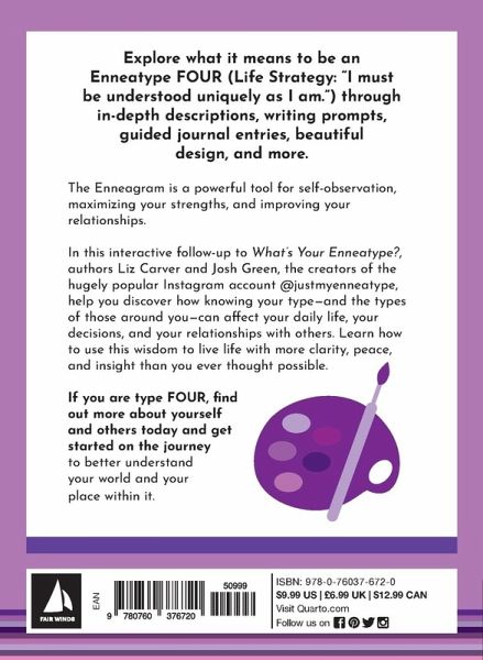 Explore what it means to be an Enneatype FOUR (Life Strategy: “I must be understood uniquely as I am.”) through in-depth descriptions, writing prompts, guided journal entries, beautiful illustrations, and more. Pronounced ENN-EE-UH-GRAM, stemming from the Greek words ennea (nine) and grammos (a written symbol), the Enneagram is a centuries-old categorization tool that classifies human personalities into nine interconnected personality types. It is a powerful tool for self-observation, maximizing your strengths, and improving your relationships. In this shorter, giftier, and interactive follow-up to What’s Your Enneatype? (Fair Winds Press, 2020), authors Liz Carver and Josh Green, the creators of the hugely popular Instagram account @justmyenneatype, help you discover how knowing your type—and the types of those around you—can affect your daily life, your decisions, and your relationships with others. Learn how to use this wisdom to live life with more clarity, peace, and insight than you ever thought possible. If you are type FOUR, find out more about yourself and others today and get started on the journey to better understand your world and your place within it.