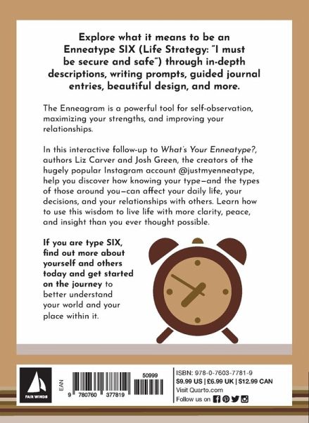 Explore what it means to be an Enneatype 6 (Life Strategy: “Own your power.”) through in-depth descriptions, writing prompts, guided journal entries, beautiful illustrations, and more. Pronounced ENN-EE-UH-GRAM, stemming from the Greek words ennea (nine) and grammos (a written symbol), the Enneagram is a centuries-old categorization tool that classifies human personalities into nine interconnected personality types. It is a powerful tool for self-observation, maximizing your strengths, and improving your relationships. In this shorter, giftier, and interactive follow-up to What’s Your Enneatype? (Fair Winds Press, 2020), authors Liz Carver and Josh Green, the creators of the hugely popular Instagram account @justmyenneatype, help you discover how knowing your type—and the types of those around you—can affect your daily life, your decisions, and your relationships with others, and how to use this wisdom to live life with more clarity, peace, and insight than you ever thought possible. If you are type SIX, find out more about yourself and others today and get started on the journey to better understand your world and your place within it.
