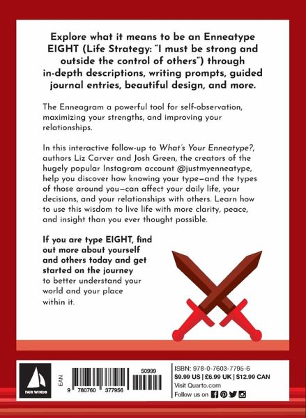 Explore what it means to be an Enneatype 8 (Life Strategy: “I must be strong and outside the control of others”) through in-depth descriptions, writing prompts, guided journal entries, beautiful illustrations, and more. Pronounced ENN-EE-UH-GRAM, stemming from the Greek words ennea (nine) and grammos (a written symbol), the Enneagram is a centuries-old categorization tool that classifies human personalities into nine interconnected personality types. It is a powerful tool for self-observation, maximizing your strengths, and improving your relationships. In this shorter, giftier, and interactive follow-up to What’s Your Enneatype? (Fair Winds Press, 2020), authors Liz Carver and Josh Green, the creators of the hugely popular Instagram account @justmyenneatype, help you discover how knowing your type—and the types of those around you—can affect your daily life, your decisions, and your relationships with others, and how to use this wisdom to live life with more clarity, peace, and insight than you ever thought possible. If you are type EIGHT, find out more about yourself and others today and get started on the journey to better understand your world and your place within it.