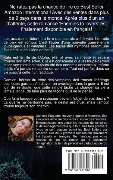 Acclamé dans plus de 9 pays dans le monde! Best Sellers Amazon à de multiples reprises. Considéré pour une adptation au cinéma et finalement disponible en français! "J'ai entendu ma louve m'appeler. Elle voulait que j'aille vers lui. Mais je lui ai dit d'arrêter, elle devait avoir tort. Cet homme m'avait kidnappé. C'était l'ennemi. C'était un vampire, pour l'amour de Dieu ! Pourquoi étais-je si attirée par lui?" Un prince vampire puissant et séduisant. La fille forte de l'Alpha. Des ennemis de naissance, liés par un lien indéfectible. Les assassins rôdent. Le livre des secrets a été volé. Le traité de paix est rompu. C'est l'aube d'une nouvelle guerre entre loups-garous et vampires. Les terres des nymphes seront une fois de plus souillées de sang. Kate est la fille de l'Alpha, elle vit avec sa meute et espère trouver son âme s¿ur. Elle est consciente que les loups-garous et les vampires ont toujours été des ennemis ancestraux, même si elle n'a jamais rencontré de vampire. Tout est parfait dans sa vie jusqu'à cette nuit fatidique. Damien, héritier du trône des vampires, doit trouver l'héritage des loups-garous afin d'avoir un avantage dans la guerre. Il est loin de se douter que cette simple tâche va changer sa vie à jamais, et ce, de bien plus de façons qu'il ne le pense. Que faire lorsque votre ravisseur devient l'objet de vos désirs ? La guerre ne pardonne pas, le destin est cruel, mais l'amour trouve toujours son chemin. Voyez pour vous même le livre qui a tant fait parler!