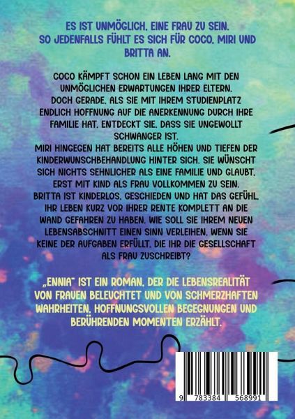 Es ist unmöglich, eine Frau zu sein. So jedenfalls fühlt es sich für Coco, Miri und Britta an. Coco kämpft schon ein Leben lang mit den unmöglichen Erwartungen ihrer Eltern. Doch gerade, als sie mit ihrem Studienplatz endlich Hoffnung auf die Anerkennung durch ihre Familie hat, entdeckt sie, dass sie ungewollt schwanger ist. Miri hingegen hat bereits alle Höhen und Tiefen der Kinderwunschbehandlung hinter sich. Sie wünscht sich nichts sehnlicher als eine Familie und glaubt, erst mit Kind als Frau vollkommen zu sein. Britta ist kinderlos, geschieden und hat das Gefühl, ihr Leben kurz vor ihrer Rente komplett an die Wand gefahren zu haben. Wie soll sie ihrem neuen Lebensabschnitt einen Sinn verleihen, wenn sie keine der Aufgaben erfüllt, die ihr die Gesellschaft als Frau zuschreibt?"Ennia" ist ein Roman, der die Lebensrealität von Frauen beleuchtet und von schmerzhaften Wahrheiten, hoffnungsvollen Begegnungen und berührenden Momenten erzählt.